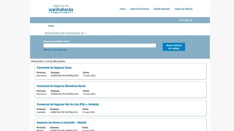 Seguros Santa Lucía está contratando y en su página web se pueden encontrar 335 ofertas de empleo, muchas de ellas para comerciales en sus oficinas y con opción de teletrabajo. Así, se necesitan comerciales en Gava, Sants, Vall de Uxo, Madrid, Béjar, San Bernardo (Madrid), Burgos, Rubí, Arévalo, Sagunto o Molina de Segura.