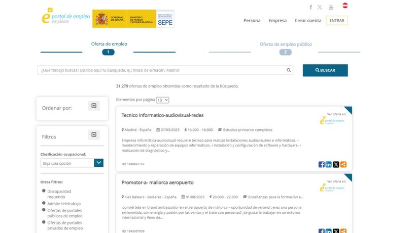 El portal de empleo del SEPE, ‘Empléate’, publica 31.279 ofertas de trabajo para diferentes sectores profesionales y candidatos con y sin experiencia. Hay empresas de las que se anuncian en este portal, que ofrecen ventajas como teletrabajo o pluses por venta en el caso de determinados empleos como comerciales. Para apuntarse habrá que estar dado de alta como demandante de empleo y acceder desde la web laboral del SEPE.
