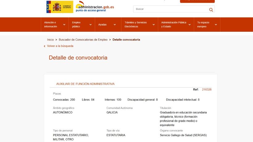El Servicio Gallego de Salud (SERGAS) ha publicado una convocatoria de oposiciones con 200 plazas de las que 84 son de libre acceso, 100 para promoción interna, 8 para discapacidad general y 8 para discapacidad intelectual.