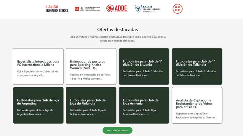 El portal laboral Futboljobs que cuenta con el respaldo de entidades tan conocidas como la UCAM, la RFEF o la Liga, anuncia más de 150.000 ofertas de empleo por todo el mundo. Para acceder a estas, hay que entrar en la web y publicar en ‘Buscar empleo’. Se abrián en primer lugar las destacadas y luego habrá que darle a ‘ver más ofertas'.