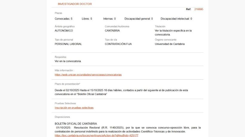 La Universidad de Cantabria publica en el Boletín Oficial de Cantabria (BOC) la convocatoria de nuevas plazas de oposiciones con 5 vacantes, todas ellas por turno libre. El tipo de personal es laboral de turno fijo. El plazo de solicitud está abierto hasta el 15 de octubre y las bases de la convocatoria se pueden leer en el BOC.