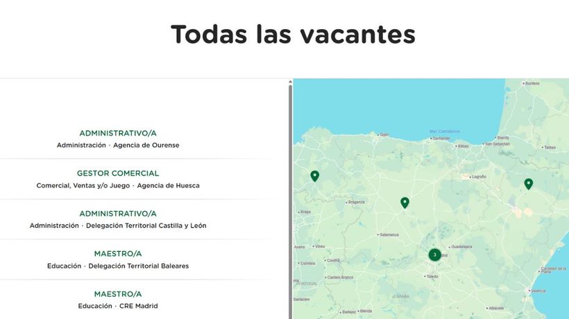 La ONCE cuenta con varias ofertas de empleo publicadas en su portal web aunque en este caso no son para vender cupones. Buscan un administrativo para la agencia de Ourense gestor comercual en Huesca, personal de oficina en Castilla y León, maestro en Baleares y en CRE Madrid. Además, dos técnicos, uno de ellos de procesos en Madrid (oficinas centrales) y el otro especialista ens servicios bibliográficos también en Madrid.