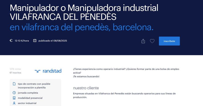 Randstad lanza una vacante de Manipulador/a industrial en Vilafranca del Penedès (Barcelona).