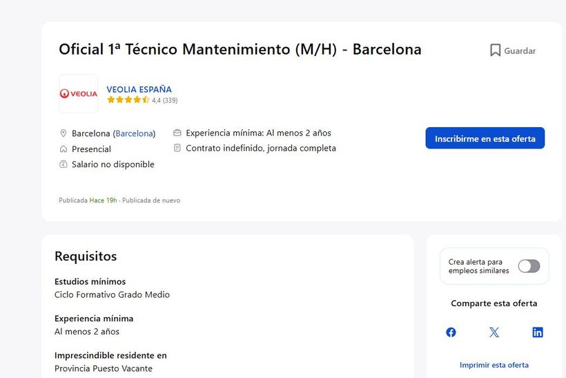Veolia necesita incorporar a un Oficial de 1.ª para funciones de mantenimiento en Barcelona.