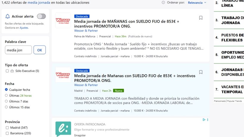 Infojobs cuenta con 1.422 ofertas de empleo para personas que quieran trabajar a media jornada. Los puestos están repartidos por varias empresas y aunque sea un contrato a tiempo parcial, se pueden encontrar sueldos altos de hasta 24.000 euros como es el caso de promotores de ONG.