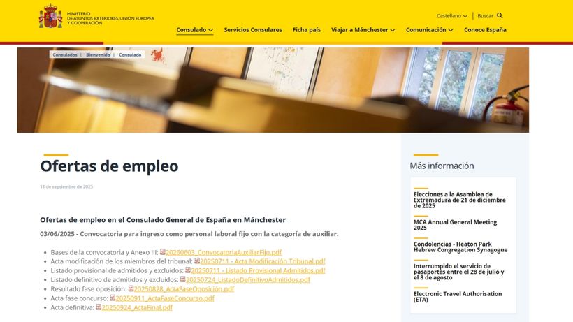 El Ministerio de Asuntos Exteriores, Unión Europea y Cooperación ha abierto una bolsa de empleo público para interinos en el Consulado de España en Manchester. El plazo de solicitud está abierto hasta el día 10 de noviembre y los nuevos empleados públicos serán personal laboral con contrato temporal.
