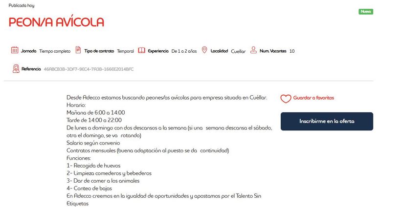 Desde Adecco buscan peones/as avícolas para empresa situada en Cuéllar.