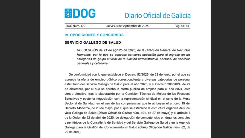 El Servicio Gallego de Salud (SERGAS) ha publicado en el DOG y en la web de Administración del Gobierno la convocatoria de oposiciones para personal de servicios generales con 236 plazas. De estas, hay 100 para acceder por turno libre y 118 para promoción interna.