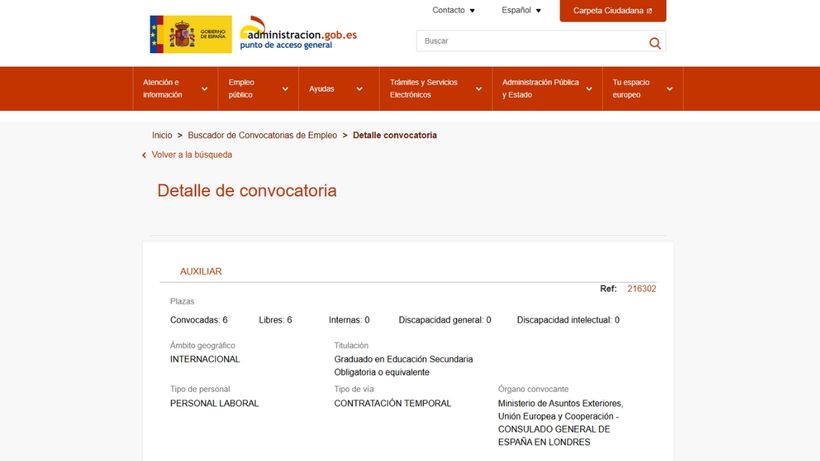 La página de la Administración del Gobierno de España ha publicado la convocatoria de 6 plazas de oposiciones (todas ellas por acceso libre) para personal laboral con contratación temporal en el Consulado General de España en Londres. Es el Ministerio de Asuntos Exteriores, Unión Europea y Cooperación el que ha hecho público este proceso selectivo.