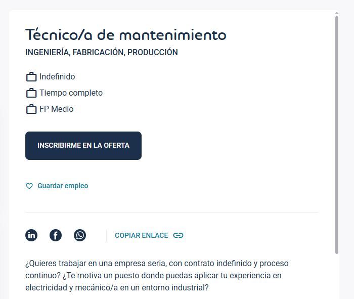 La oferta incluye contrato inicial por ETT con posibilidad de incorporación estable a plantilla. Se necesita incorporación inmediata, carné de conducir y vehículo o transporte propio para acceder al centro de trabajo.