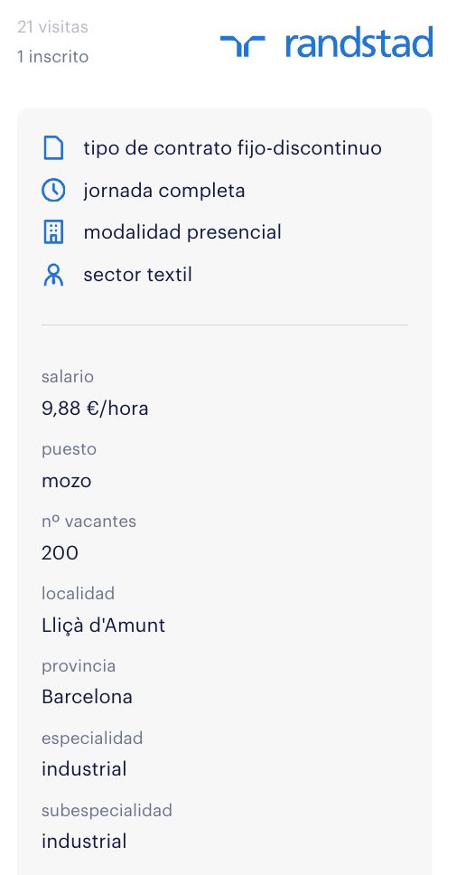 Se ofrece contrato fijo-discontinuo a jornada completa, con turnos de mañana o tarde bajo el sistema 6+3 (6 días de trabajo y 3 de descanso). El salario es de 9,88 euros/hora y existe la posibilidad de continuar y pasar a plantilla. Valorable tener vehículo propio para acceder al centro logístico.