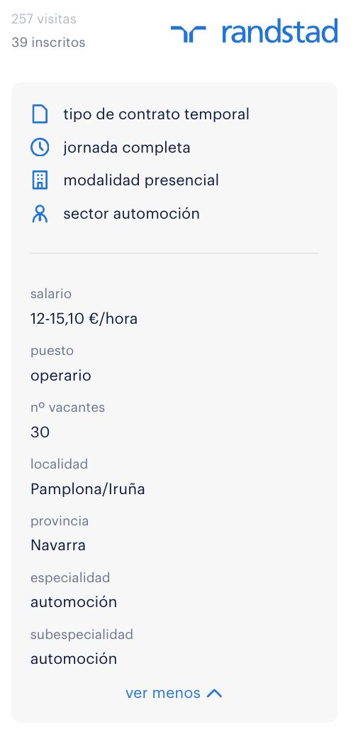 Randstad selecciona 30 operarios/as para diferentes empresas del sector automoción ubicadas en Pamplona/Iruña y alrededores. Se ofrece jornada completa, incorporación inmediata y contratos temporales con posibilidad de renovación.