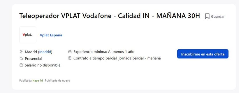Infojobs saca una oferta de Teleoperador VPLAT Vodafone en Madrid.