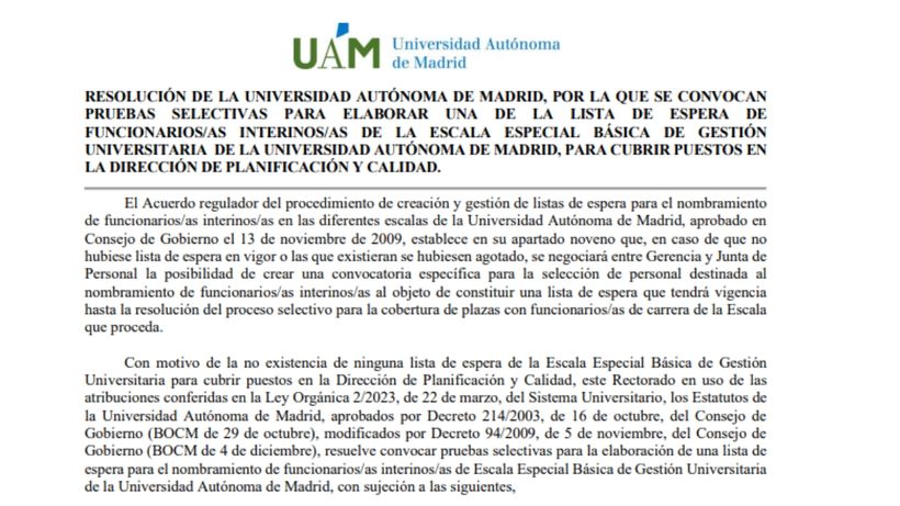 La Universidad Autónoma de Madrid ha abierto una bolsa de empleo público parea profesionales de escala especial básica en la rama de gestión y planificación (departamento de Calidad). Para acceder piden el título de Bachillerato, técnico o equivalente y los que accedan a una de las vacantes serán personal funcionario interino.