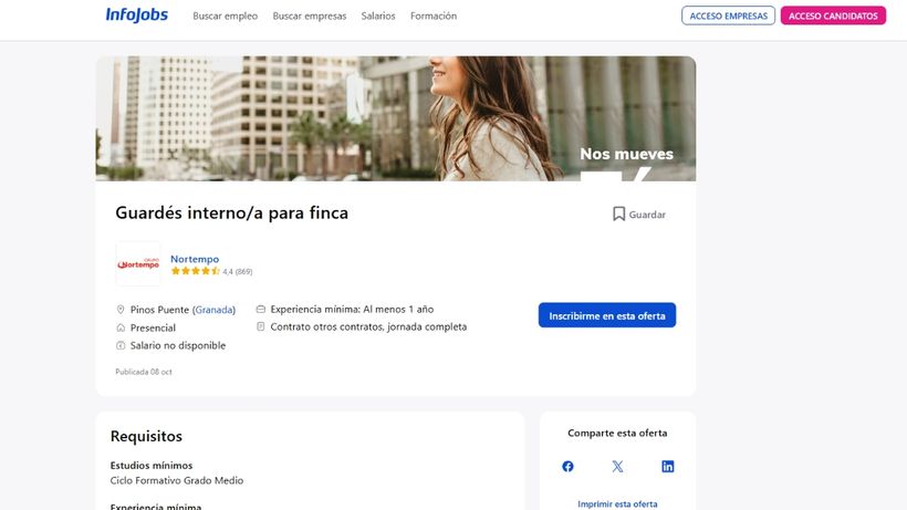 Para conseguir el puesto de guardés en Pinos Puente lo primero es entrar en la web de Infojobs donde hay que poner en el buscador la palabra ‘guardés’. Y una vez que se haya localizado la que dice ‘guardés interno/a para finca’ hay que revisar si se cumplen los requisitos y pulsar en ‘Inscribirme a esta oferta’.