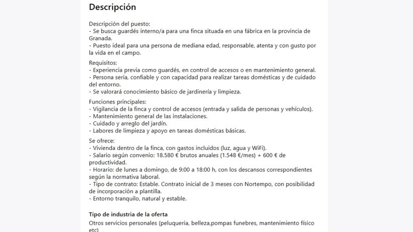 La oferta de empleo está publicada en InfoJobs y entre las condiciones laborales aparece un sueldo de 18.580 euros brutos anuales (1.548 euros al mes) con el pago de 600 euros extra por productividad. El empleo es a jornada completa y piden a los candidatos un año de experiencia realizando funciones similares a las que se piden en esta empresa, una conocida fábrica.