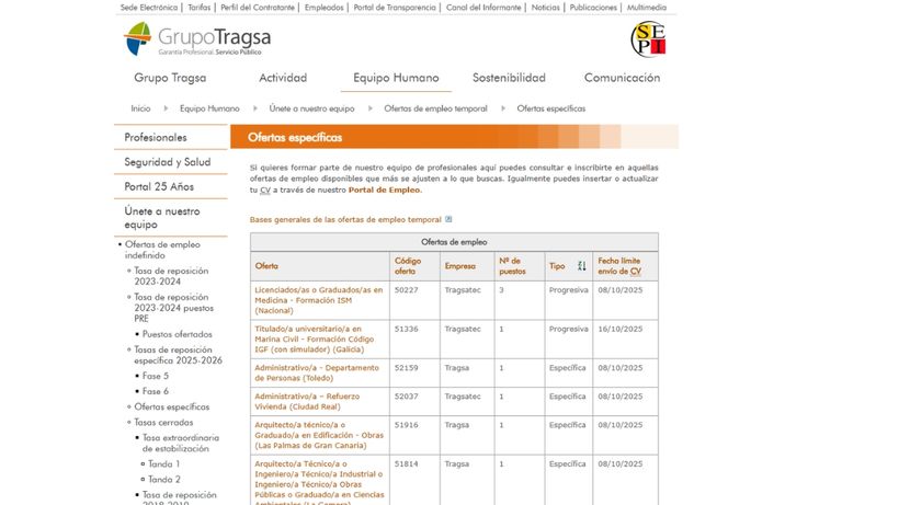 Para enviar el currículum a Tragsa hay que entrar en el portal de empleo de esta empresa, seleccionando ‘Únete a nuestro equipo’. Saldrán todas las ofertas de trabajo disponibles, donde se podrá ver cuál es el puesto a cubrir, el código de la oferta, la empresa (Tragsa o Tragsatec), el número de puestos, el tipo y la fecha límite para inscribirse.