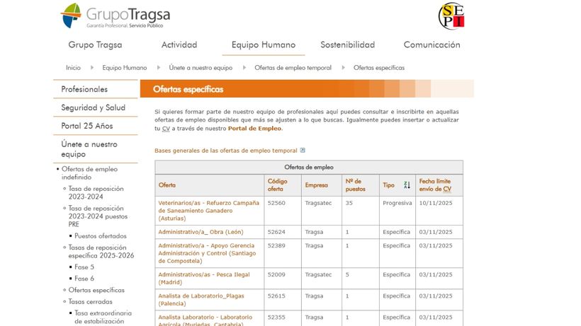 Grupo Tragsa y Tragsatec, empresa pública que se dedica a la conservación de la naturaleza y al desarrollo rural, ha actualizado su bolsa de empleo y cuenta con 358 ofertas activas. Necesitan profesionales de todo tipo como administrativos, veterinarios y en el sector de la ingeniería. Además, cuentan con algunas vacantes que son específicas para personas con discapacidad (acreditada igual o superior al 33%).