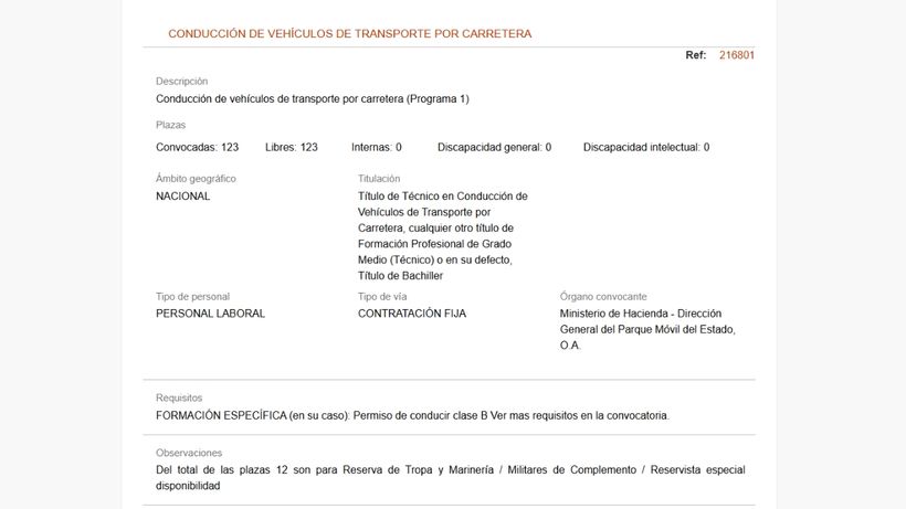 Piden como requisito tener Título de Técnico en Conducción de Vehículos de Transporte por Carretera, cualquier otro título de Formación Profesional de Grado Medio (Técnico) o en su defecto, Título de Bachiller y el ámbito geográfico es nacional.