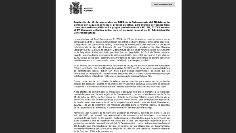 El Ministerio de Defensa ha publicado 46 plazas (43 libres y 3 para personas con discapacidad) para trabajar como docente (personal laboral). Se trata de la Oferta de empleo público para la tasa adicional de jubilación parcial 2025. Del total de las plazas, 19 son para la Reserva de Tropa y Marinería / militares de complemento / reservista especial disponibilidad.