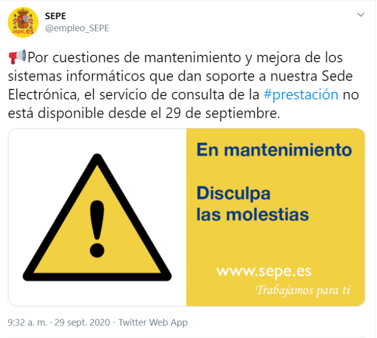 El comunicado del SEPE aparece en su cuenta oficial de Twitter con el siguiente mensaje “por cuestiones de mantenimiento y mejora de los sistemas informáticos que dan soporte a nuestra Sede Electrónica SEPE, el servicio de consulta de la prestación no está disponible desde el 29 de septiembre”.