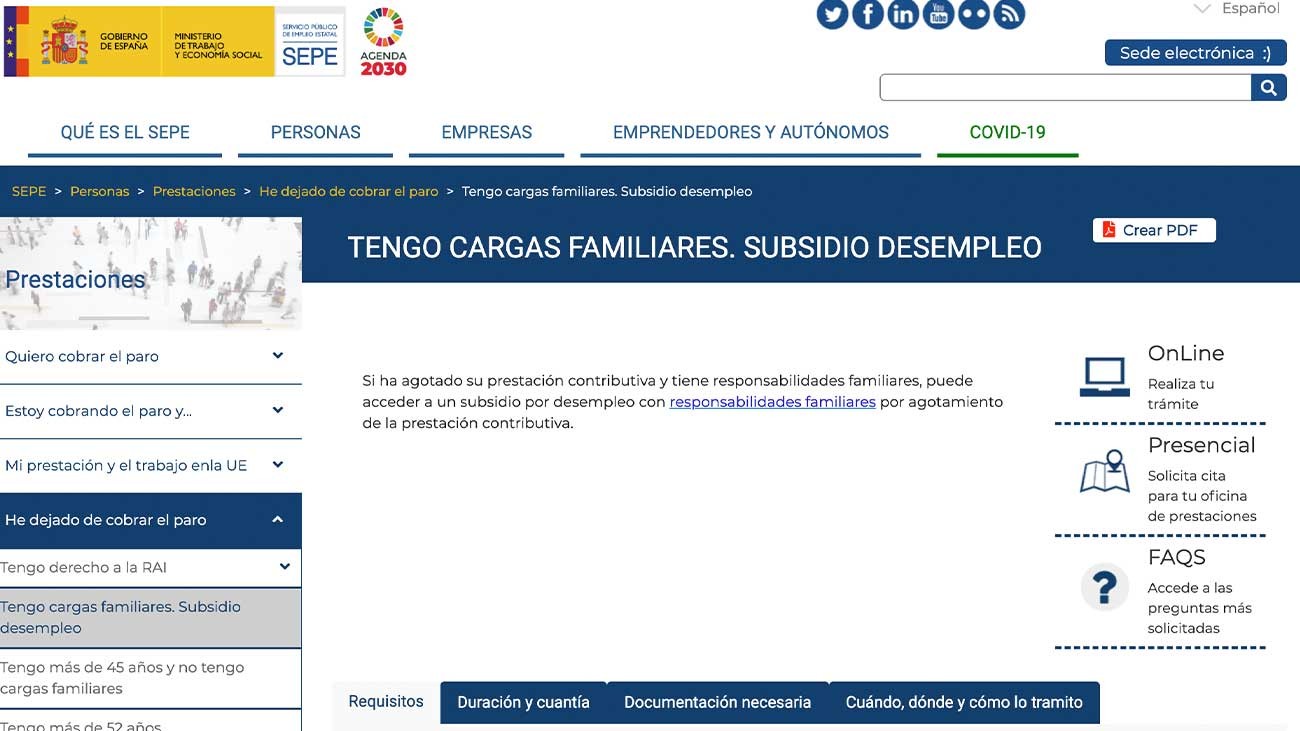 Aquí aparece ahora la opción de pedir el subsidio por desempleo con responsabilidades familiares. En este caso, el máximo de espera entre que terminas de cobrar el paro y realizas la solicitud del subsidio, no puede ser mayor a 15 días.