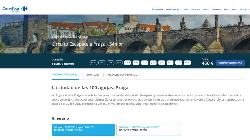 El viaje a Praga que vende Carrefour cuesta desde 485 euros por persona aunque el precio cambia en función del día que se elija para viajar. Se podrá comprobar tanto el coste como los días libres accediendo al calendario que aparece en ‘Ver disponibilidad’.
