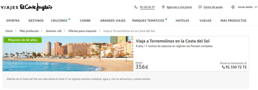 Viajes El Corte Inglés vuelve a plantar cara a los viajes del Imserso (Instituto de Mayores y Derechos Sociales) con una baratísima escapada a uno de los destinos favoritos del turismo sénior. En esta ocasión, la agencia oferta una estancia de ocho días y siete noches en hotel de cuatro estrellas en régimen de pensión completa desde 356 euros por persona en Torremolinos (Málaga).