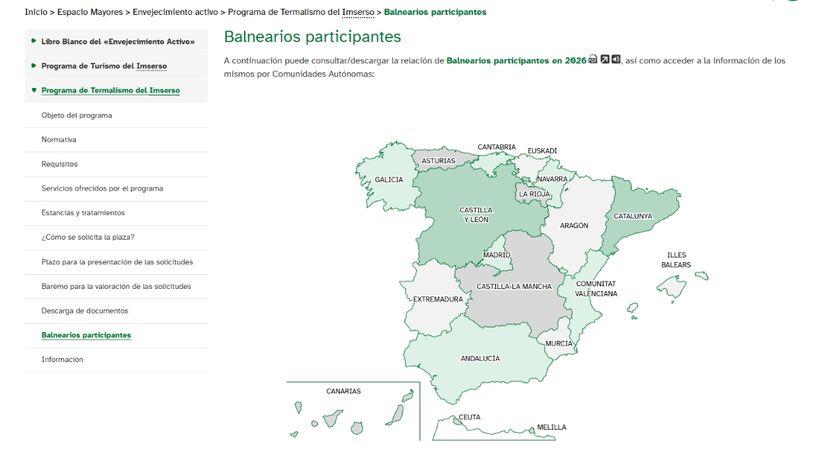 Para consultar el listado completo de balnearios para personas mayores, el precio y la fecha en que se puede reservar, habrá que entrar en la web del Imserso. Una vez dentro, aparece un mapa con todas las Comunidades Autónomas. Habrá que entrar en cada una de ellas para que se abra el listado por provincias. Ahí, hay que seleccionar el nombre de la provincia a la que se quiera viajar y cuando aparezca el nombre de los balnearios, pinchar sobre el que interese para completar la solicitud.