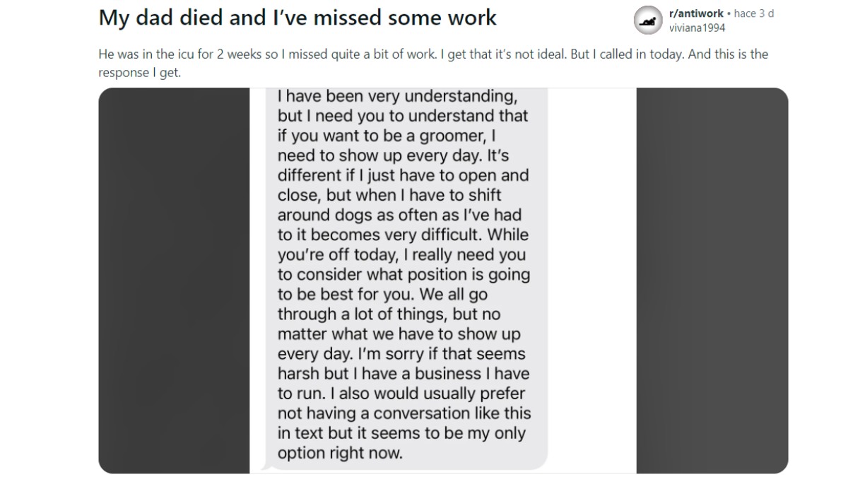 La empleada estaba atravesando el doloroso proceso de duelo por la pérdida de su padre, quien estuvo ingresado en la UCI durante dos semanas, cuando recibió el fatídico mensaje. Decidió publicarlo en el foro y expuso cómo, a pesar de sus circunstancias personales, la respuesta de su jefe fue totalmente insensible y nada empática.