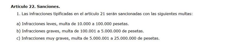 Según el artículo 22 de la misma ley, las infracciones graves pueden ser sancionadas con multas de entre 100.001 y 5.000.000 de pesetas, lo que equivale a más de 30.000 euros en su tramo máximo.