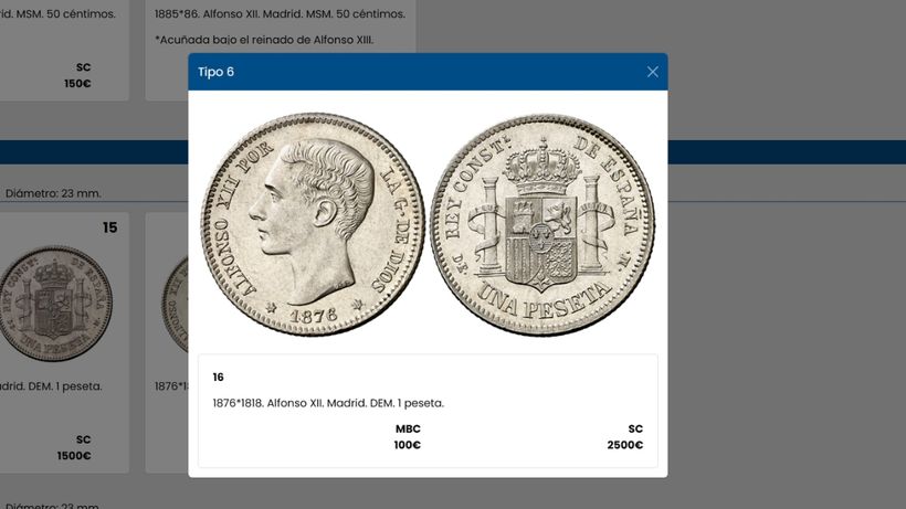 Hay algunas que han hecho historia en España y que, dependiendo de su estado de conservación o de si tienen alguna tara pueden valer miles de euros. Es el caso de la moneda de Alfonso XII, acuñada en el año 1876 en Madrid que aparece en el catálogo de la casa de subastas Aureo&Calicó. En estado SC, esto es, sin circular, cuesta 2.500 euros.