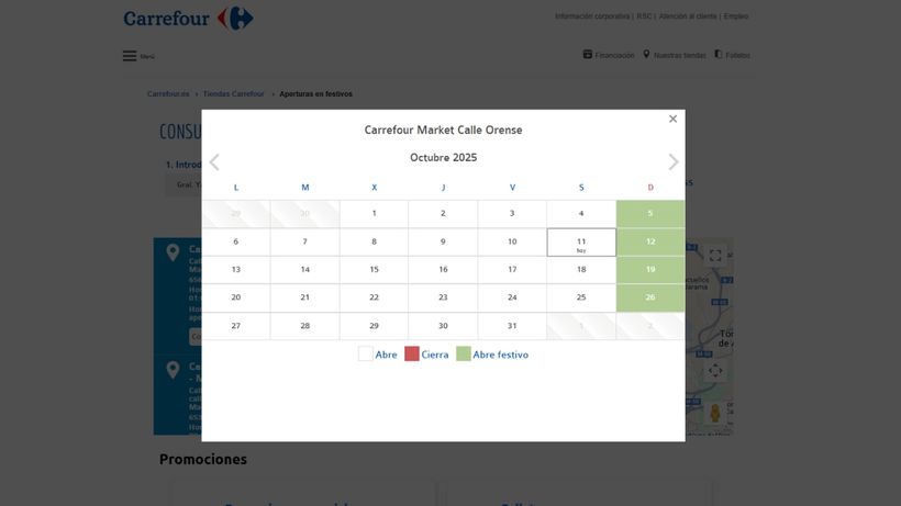Supermercados Carrefour abre el día festivo 12 de octubre, aunque habrá que consultarlo previamente según la localidad en la que se quiera comprar, aunque caiga en domingo como aparece en el calendario de apertura que se podrá ver en su página web poniendo en la barra de búsqueda el nombre del municipio.