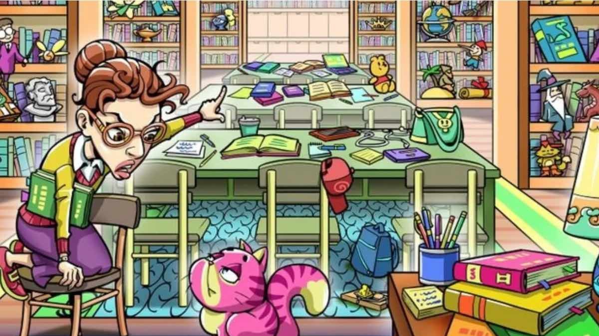 En la siguiente imagen, se verá a una mujer subida sobre una silla, asustada y enfadada indicándole a su gato que busque y encuentre al ratón que se encuentra escondido en la biblioteca. ¿Serías capaz de hallar al roedor antes que lo haga el felino? Tienes 6 segundos para lograrlo, ¿te animas?