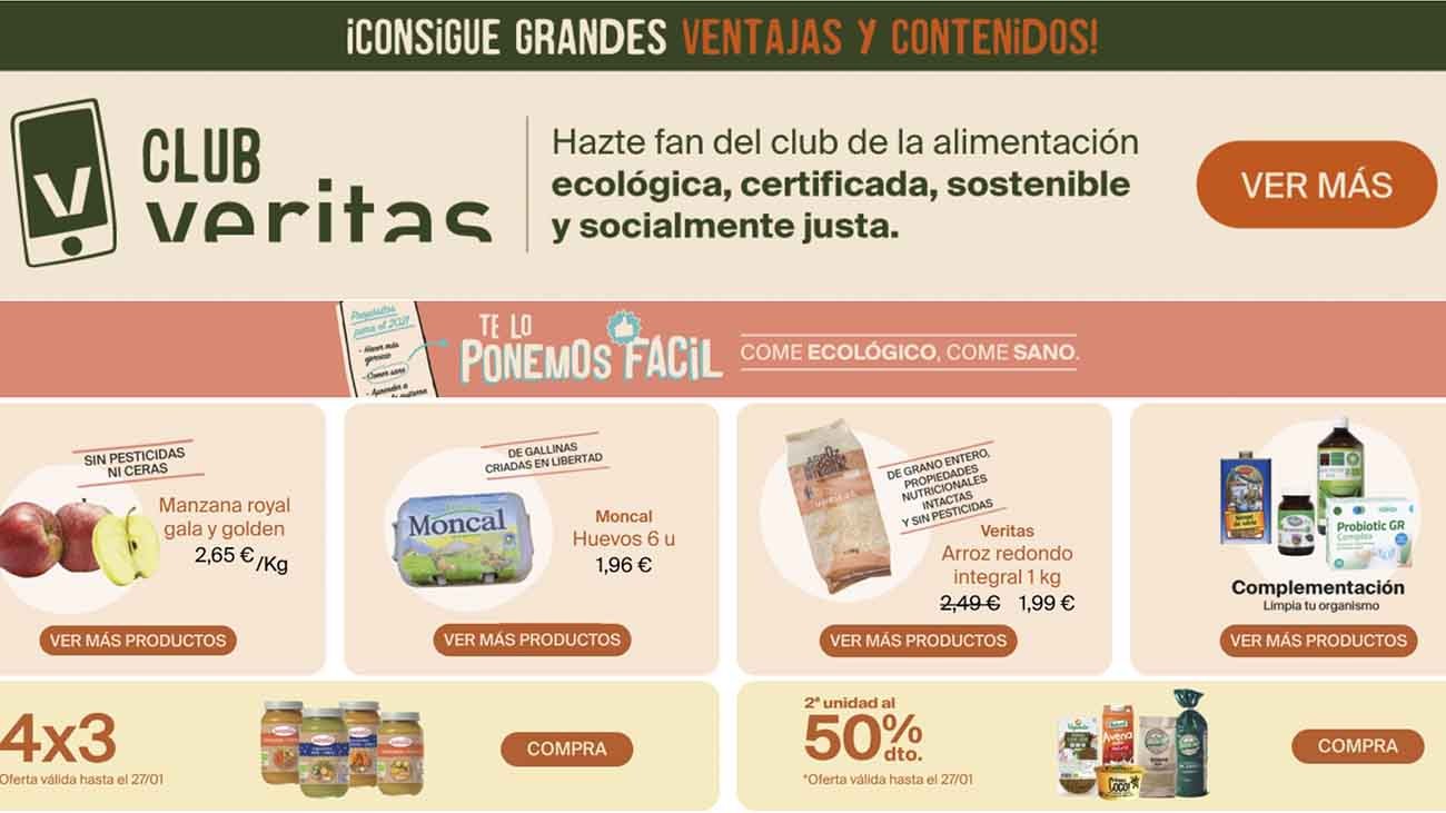 "Come ecológico, come sano” . Con este lema, Veritas te invita a alimentarte de manera saludable y responsable. Para ello te invita a su club, al que podrás acceder a recetas, consejos, compras de productos ecológicos certificados y sostenibles, descuentos…